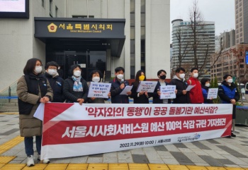 민주노총 공공운수노조 서울시사회서비스원지부는 29일 오전 서울시의회 앞에서 기자회견을 열고 “삭감된 예산안을 복구해 서울시민의 공공돌봄에 대한 ...