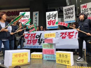기아차 비정규직 여성 노동자들이 국가인권위원회를 찾아 차별 시정을 요구했다. 사내하청 노동자를 대상으로 기아차가 진행하는 정규직 채용이 여성 노...