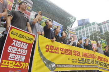 9호선 지하철 노동자들은 3년 계약 공개 입찰로 ‘계약직’으로 전락할 처지에 놓였다. 공공운수노조 서울지하철노조는 4일 서울시청 앞에서 기자회견...