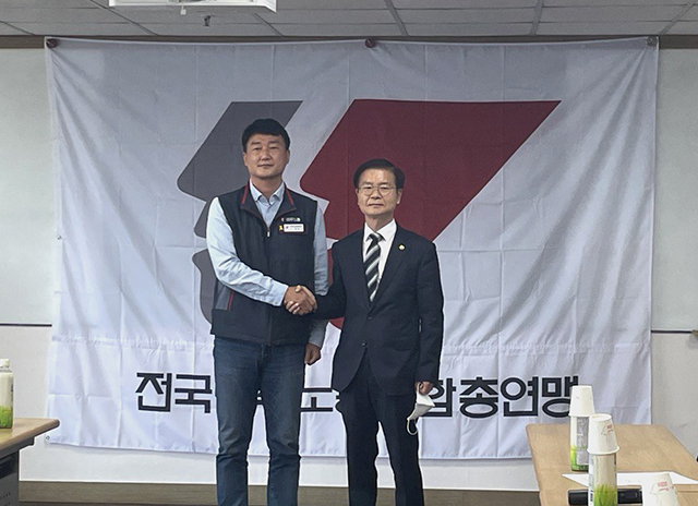 이정식 고용노동부 장관은 24일 오전 서울 중구 민주노총을 찾았고, 양경수 위원장과 간담회를 했다. 양경수 민주노총 위원장은 윤석열 정부의 반노...