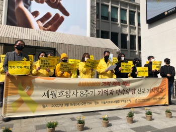 4.16세월호참사가족협의회와 4월16일의약속국민연대(4.16연대)는 16일 오전 서울시의회 세월호 기억공간 앞에서 ‘세월호참사 8주기 기억과 약...