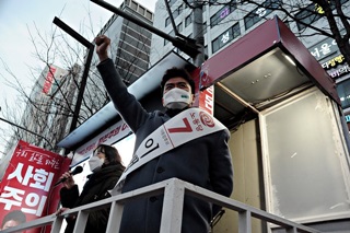 이백윤 사회주의 대선 후보가 부동산 불패의 땅이자 한국 최고 재벌인 삼성 본사가 있는 강남역에서 마지막 유세를 벌였다. 이 후보는 “기득권 재벌...