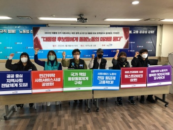 공공운수노조는 9일 오전 서울 중구 민주노총 대회의실에서 기자회견을 열고 ‘2022년 대통령 선거 사회서비스 부문 정책 요구안 및 대통령 후보 ...