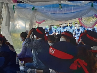오늘(29일) 아침 일찍부터 원주시 국민건강보험고객센터지부 농성장 뒤편 도로에는 경찰버스 12대가 줄지어 있다. 경찰은 집회 당일, 1천여 명의...