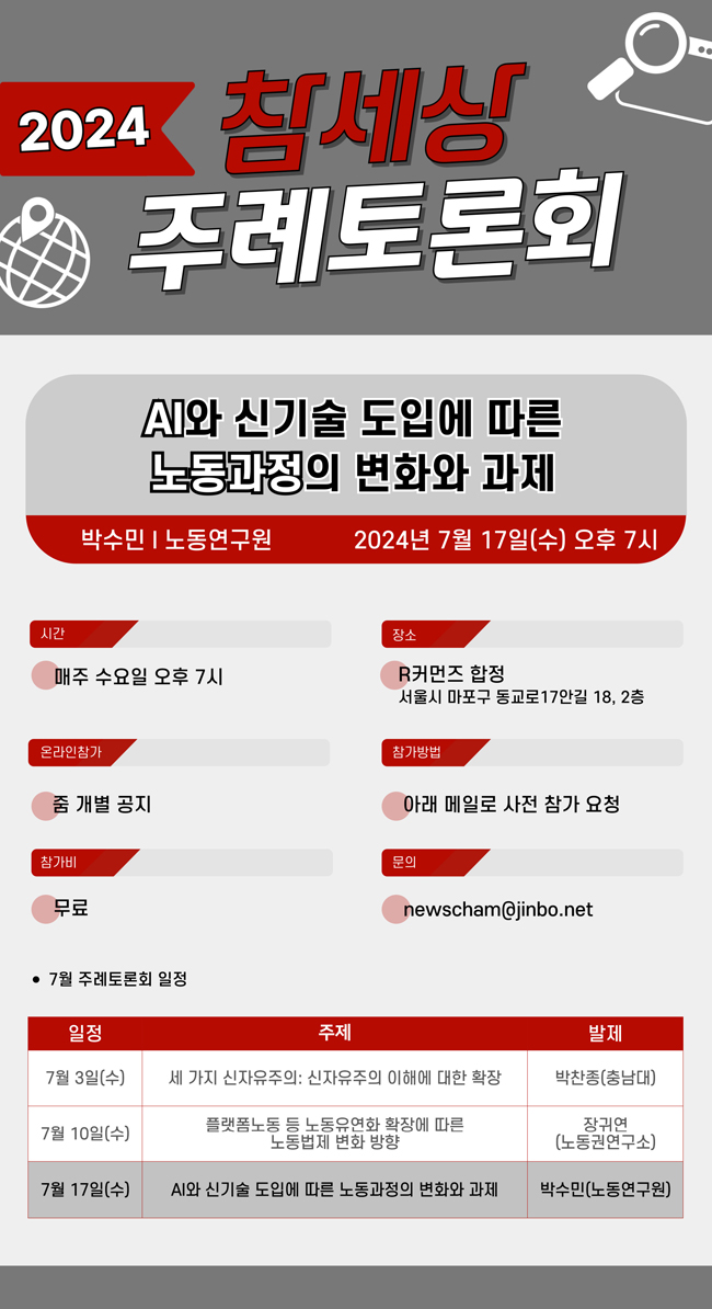 [안내] 참세상 주례토론회 2024 참세상 연구소 2024.05.01 14:12 SNS공유 닫기 공유하기 북마크하기 프린트 [매주 열리는 참세상 주례토론회 2024] “AI와 신기술 도입에 따른 노동과정의 변화와 과제” * 일시 : 2024.7.17(수) 저녁 7시 * 발제 : 박수민(노동연구원) - 장 소 : R커먼즈합정, 연구자의 집(서울 마포구 동교로 17안길 18, 2층)- 온라인 줌 : 매주 개별 공지- 참가비 : 없음- 신청방법 : newscham@jinbo.net 메일로 신청 [전체 일정] (이후 계속)