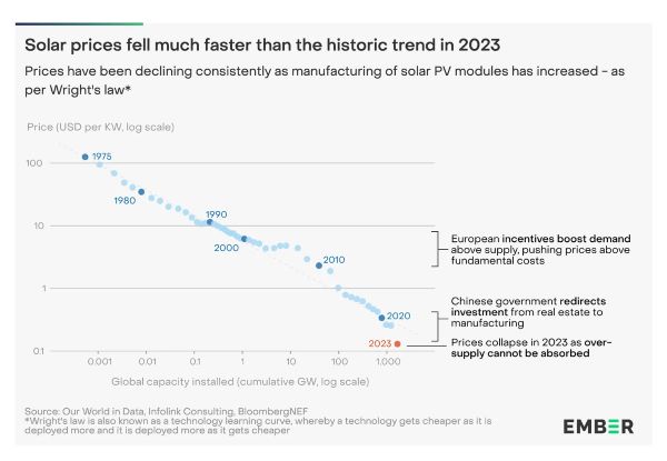 2023년 중국에서 생산된 태양광의 양은 전 세계 수요를 앞질렀고, 모듈 현물 가격은 하반기에 50% 이상 하락하여 국내 설치량이 점점 더 늘어났다. 현재 태양광 모듈 가격은 라이트의 기술 학습 곡선 법칙에 따라 예상했던 것보다 훨씬 낮은 수준이다. 중국의 국가 대출이 주거 부문에서 제조업으로 점점 더 많이 전환되면서 중국은 현재 전 세계 태양광 모듈 생산량의 80~85%를 차지하고 있다.