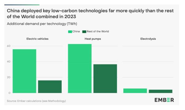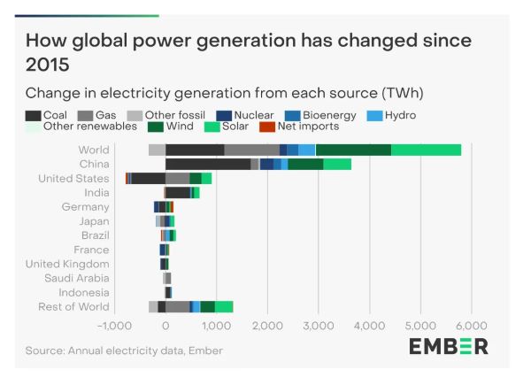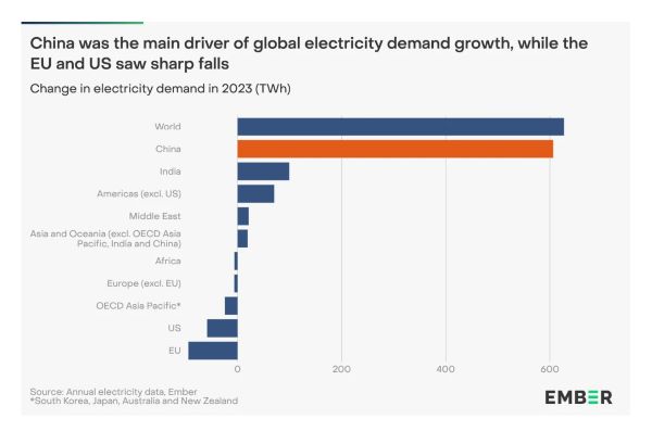 엠버의 데이터에서 알 수 있듯이: "중국은 여전히 전 세계 전력 수요 증가의 주요 동력이었다. 중국의 빠른 성장(+606TWh, +6.9%)은 전 세계 순 증가율보다 21(TWh) 낮은 수치에 불과했다. 인도의 성장(+99TWh, +5.4%)이 두 번째로 큰 기여를 했다."