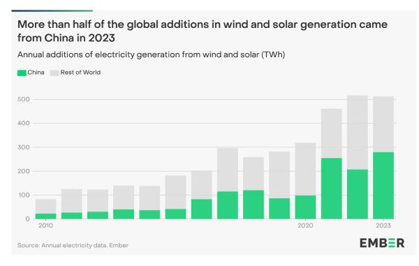 2023년 중국에서만 풍력 및 태양광 분야에서 전 세계적으로 새로 추가되는 발전소의 절반 이상을 차지했다.