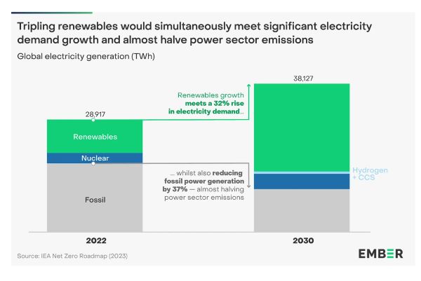 2023년 유엔기후변화협약 당사국총회(COP28)에서 전 세계 많은 국가들은 2030년까지 전 세계 재생에너지 발전 용량을 3배로 늘리기로 약속했다. 이는 2030년까지 전력 부문의 탄소 배출량을 거의 절반으로 줄일 수 있는 잠재력을 가지고 있으며, 석탄 화력 발전이 우선적으로 대체될 것이다. 또한, 전력 수요가 32% 증가함에 따라 교통, 가정 및 산업 난방의 전기화를 대체하기에 충분한 새로운 전력을 공급할 수 있을 것이다.