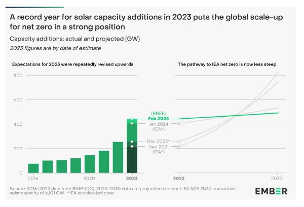 2024년 수요 증가율은 2023년(+968 TWh)보다 높을 것으로 예상되지만, 청정 발전 증가율은 더 클 것으로 예상되어(+1300 TWh) 전 세계 화석 발전량은 2% 감소(-333 TWh)할 것으로 전망된다.