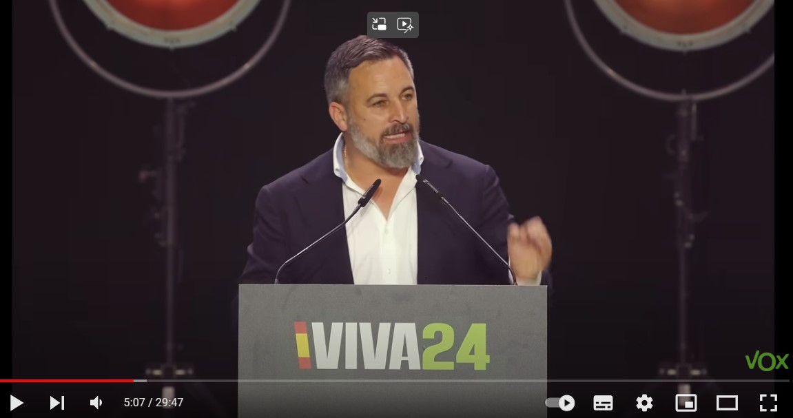 스페인 정당 복스의 지도자 산티아고 아바스칼이 2024년 5월 19일 마드리드에서 열린 전 세계 극우 정치 대회에서 연설하고 있다출처 : VOX 유투브 채널