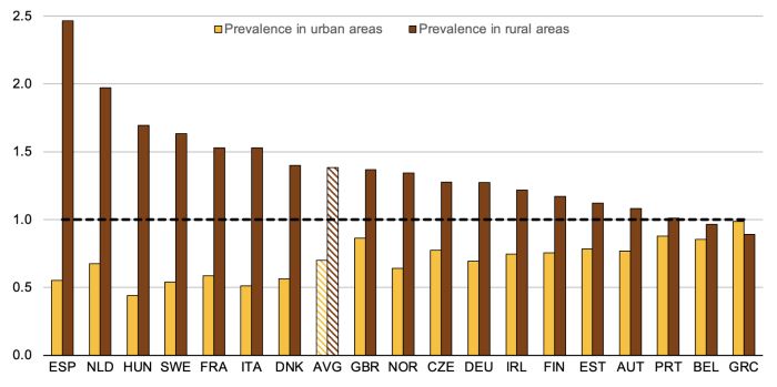 참고: 스페인에서는 오염도가 높은 일자리가 전국보다 농촌 지역에서 두 배 이상 많은 반면, 도시 지역에서는 절반에 불과하다. 출처: EULFS 및 저자 계산.