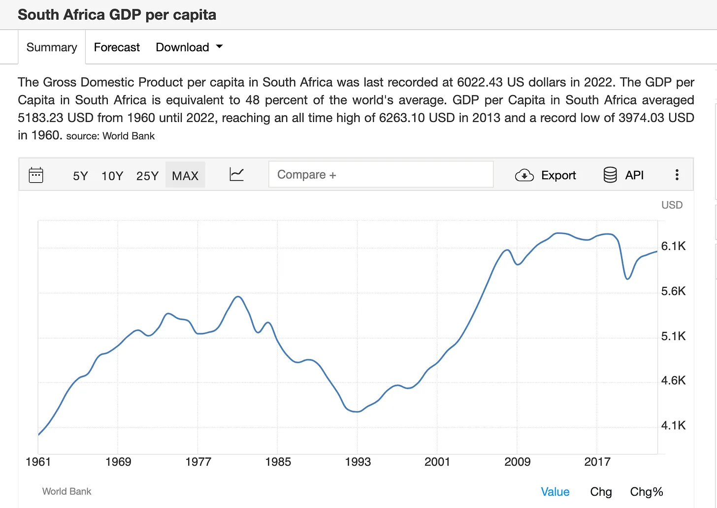 아파르트헤이트 이후 남아프리카공화국에서 ANC(아프리카민족회의)가 과반수를 잃을 것이라고는 믿기 어려웠지만, 경제적 실망과 정부의 실패로 인해 그러한 결과가 나올 가능성이 점점 더 커졌다. 2008년 이후 남아프리카공화국은 1인당 GDP(2022년 달러로 측정)의 정체를 경험했다.