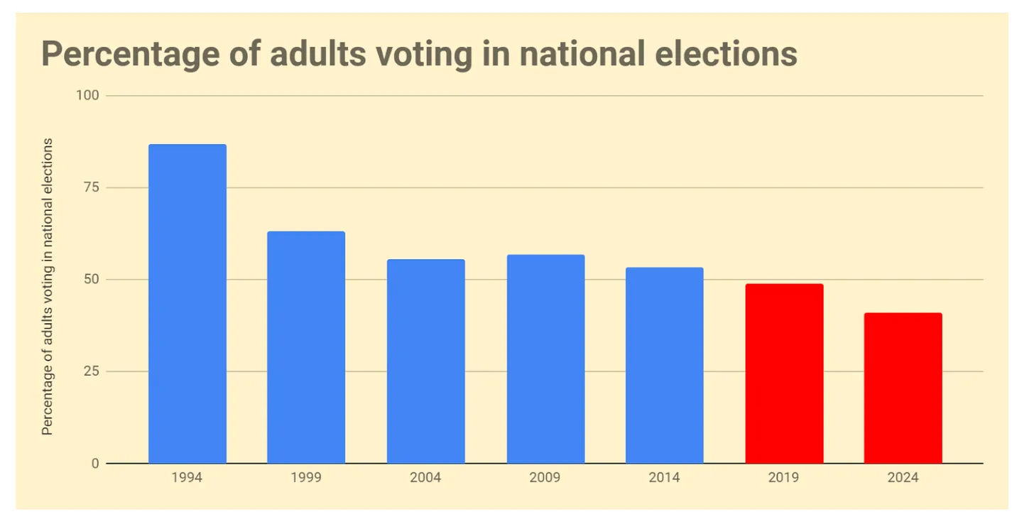 이번 선거에서 가장 우려스러운 통계는 ANC의 득표율이 40%로 떨어진 것이 아니라, 남아프리카공화국 전체 인구의 정치적 참여가 부족했다는 것이다. 낮은 유권자 등록률(64%)과 59% 미만의 투표율을 감안하면 성인 인구의 40%만이 선거에 참여했다. 특히 청년 실업률이 50%에 달하는 남아프리카공화국 젊은 층의 투표 참여율은 더욱 낮았다.