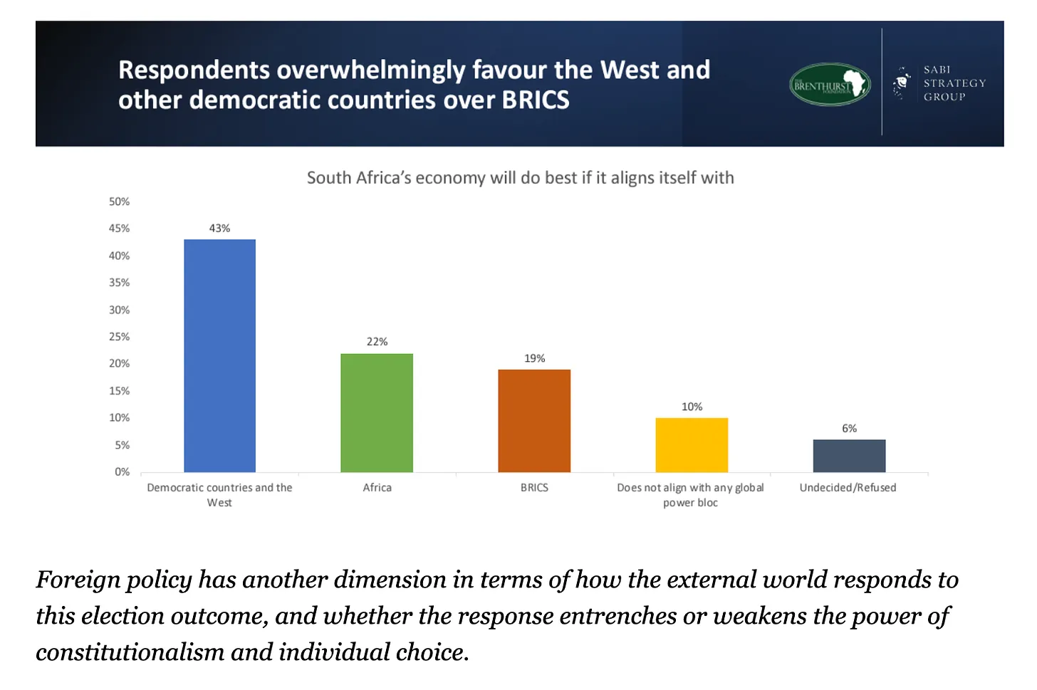 브릭스(BRICS, 브라질·러시아·인도·중국·남아프리카공화국을, 이른바 신흥경제 5국으로 묶어 일컫는 말)와 연계하여 보다 전투적인 외교 정책으로 전환한 ANC는 유권자들을 설득하지 못했다. 남아프리카공화국 국민은 2:1의 차이로 브릭스나 다른 아프리카 국가와의 동맹보다 서방과의 동맹이 경제에 더 유리하다고 생각했다.