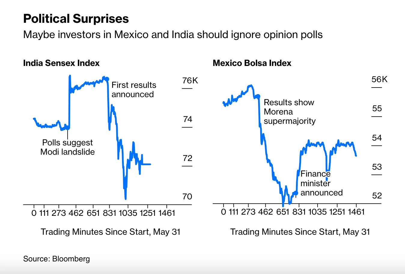 블룸버그에 따르면 인도에서는 주말 출구조사 결과(현 모디 총리의 집권당이 압승을 거둘 것이라는 전망)로 센섹스(Sensex) 지수가 급등했다가 실시간 결과에 따라 폭락하면서 이틀 동안 극적인 거래가 이어졌다. 멕시코에서는 현 집권정당 모레나(Morena)의 클라우디아 셰인바움이 예상을 약간 웃돌며 하원에서 과반수를 차지했다. 이러한 결과(모디 총리가 과반수를 차지할 것이라는 전망)가 인도에서는 집회를 일으켰고, 멕시코에서는 엄청난 매도세를 일으켰다. 분명한 것은 세금과 투자에 관한 한, 다수당의 정치적 성향과 의제가 중요하다는 것이다.
