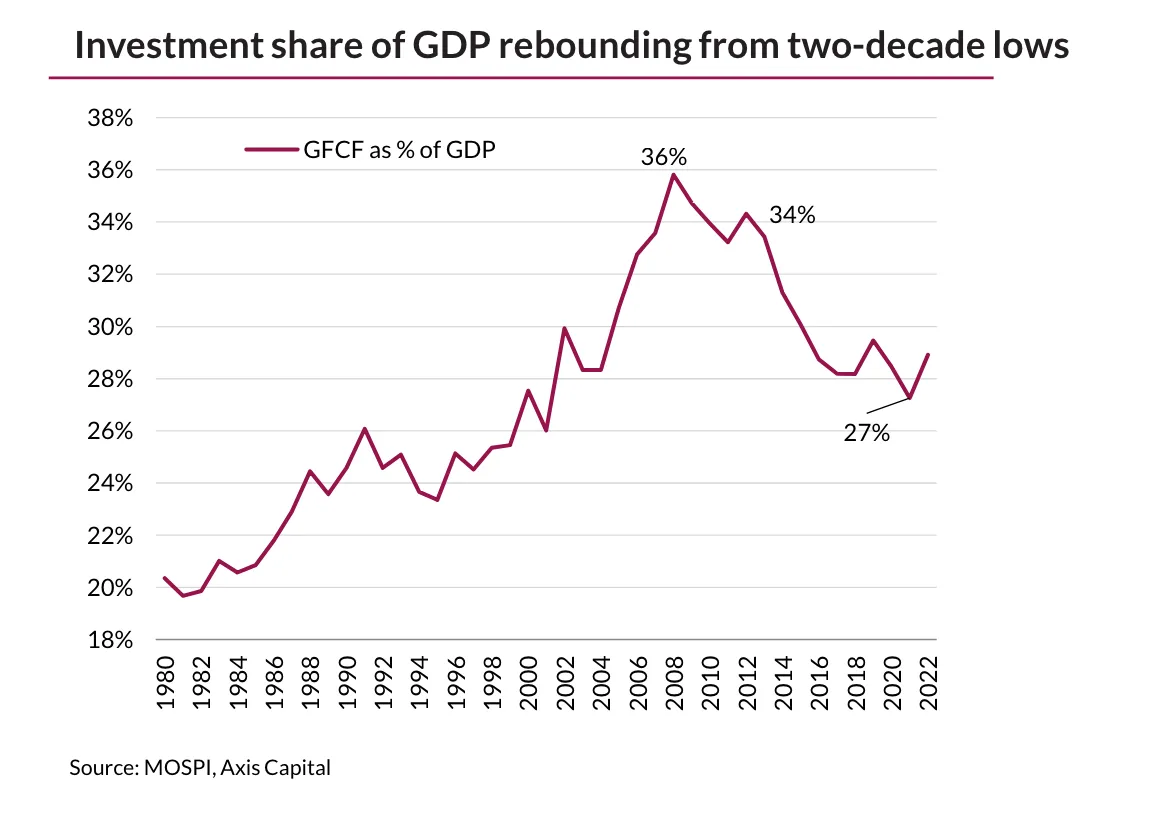모디 총리가 연정 파트너와 함께 통치해야 한다는 사실은 인도 정치사에서 그 자체로 드문 일이 아니다. 시장의 가장 큰 관심사는 모디 총리의 약화가 그의 트레이드마크였던 인프라 및 과두 정치인 주도 성장 모델에 어떤 영향을 미칠 것인가 하는 점이다. 과대 광고와는 달리 인도 전체에 대한 투자는 급증하지 않았다. GDP 대비 투자 비중은 2000년대 최고치인 36%에 비해 감소했다.