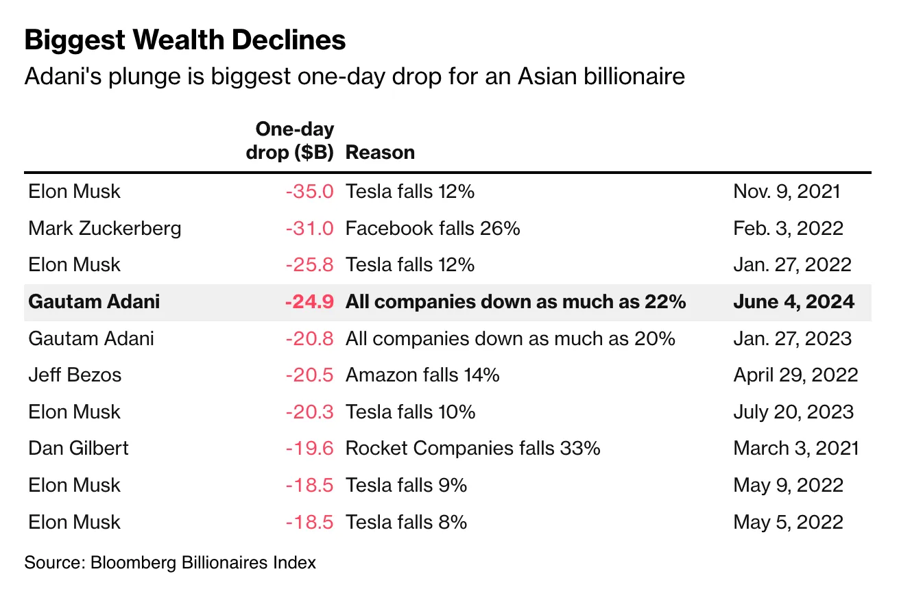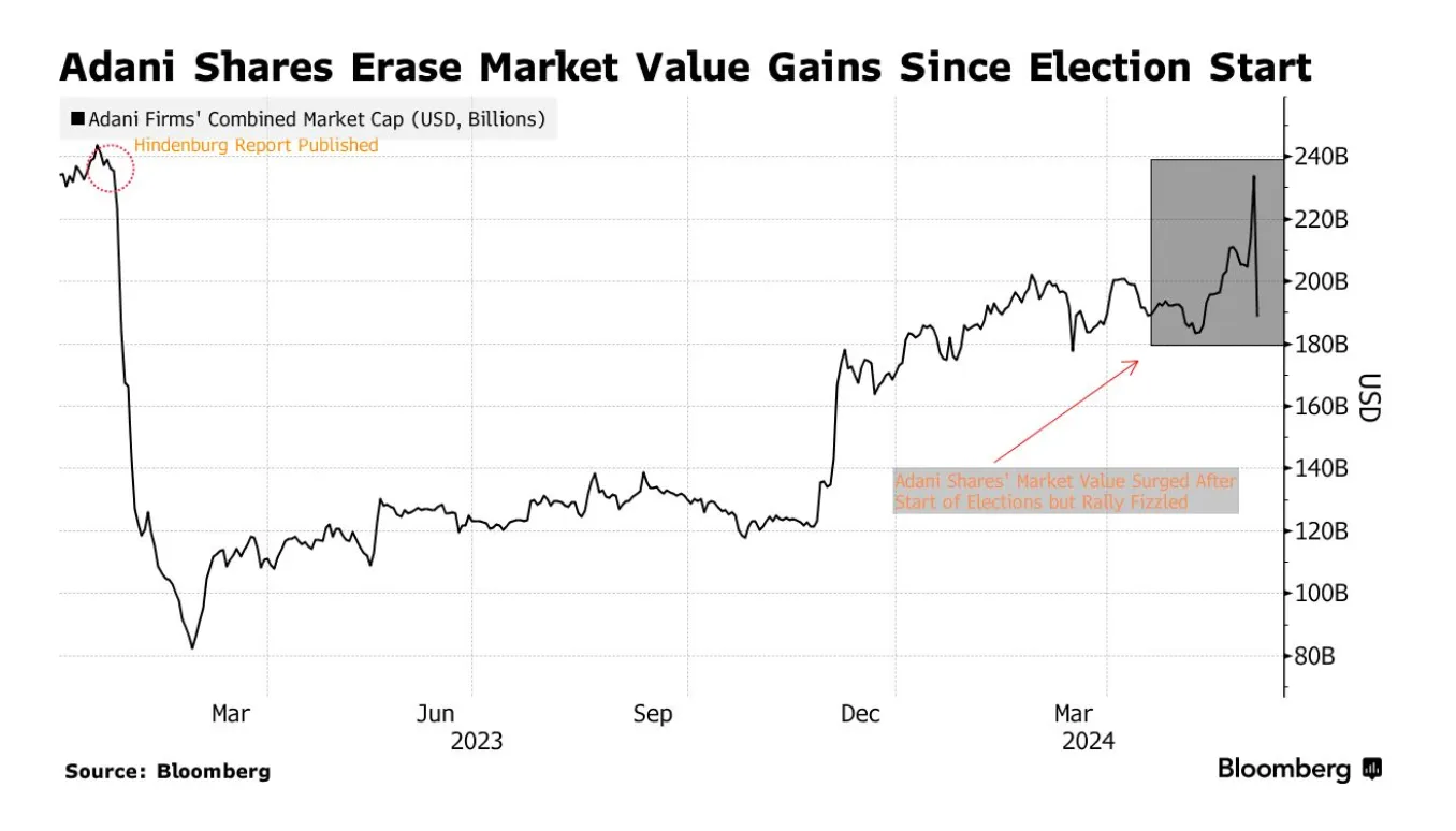 그 누구도 이 '호황'에서 고탐 아다니(Gautam Adani, 인도 국민기업 아다니그룹의 회장)보다 더 잘 해낸 사람은 없다. 아다니에게 선거 결과는 심각한 공매도 공격보다 더 큰 충격이었다. 이 인도 재벌의 재산은 화요일에 250억 달러가 무너졌다. 그의 아다니 그룹의 모든 계열사가 매각되어 하루 만에 450억 달러에 달하는 시장 가치가 사라졌다.