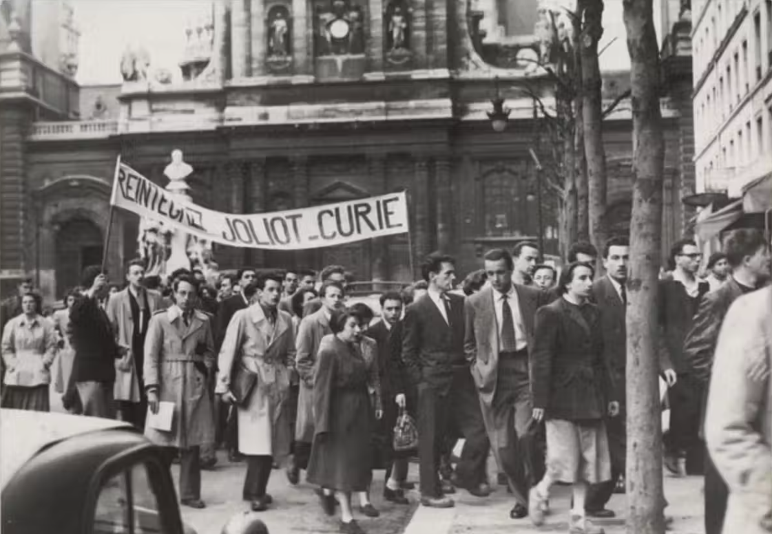 1950년 5월 프랑스 원자력위원회에서 프레데릭 졸리오의 복직을 위한 시위.  출처 : 퀴리 박물관