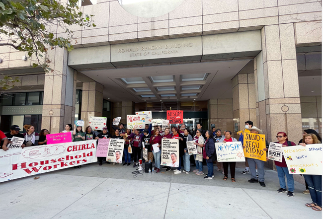 개빈 뉴섬 주지사는 이러한 배제의 유산을 2020년 SB 1257 법안에 대한 거부에서 극명하게 드러냈다이 법안은 COVID-19 팬데믹이 한창일 때 가사 노동자에게 Cal/OSHA 보호를 확대하려는 것이었지만그는 이 필수 노동자들의 안전과 존엄성보다 가정의 사생활을 우선시했다뉴섬 주지사는 표면적으로는 가정 내 고용주들이 준수할 교육을 받지 못했으며이로 인해 Cal/OSHA가 가정에 지나치게 많은 관할권을 갖게 된다는 이유로 이 법안을 거부했다고 밝혔다그러나 어떠한 청문회에서도 반대 의견은 등록되지 않았다주지사가 내세운 이러한 논리는 가정 소유자의 사생활을 취약한 노동자들의 생명보다 더 가치 있게 여기는 것으로유독 화학물질, COVID-19, 산불 연기와 같은 위험한 작업 환경에 노출된 개인들의 안전에 대한 냉담한 무시를 보여준다.