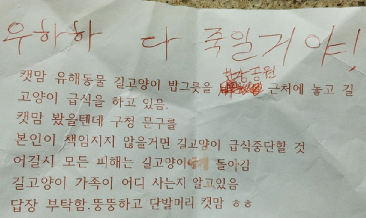 고양이를 돌보는 여성에 대한 협박 메시지. 출처: 동물권행동 카라