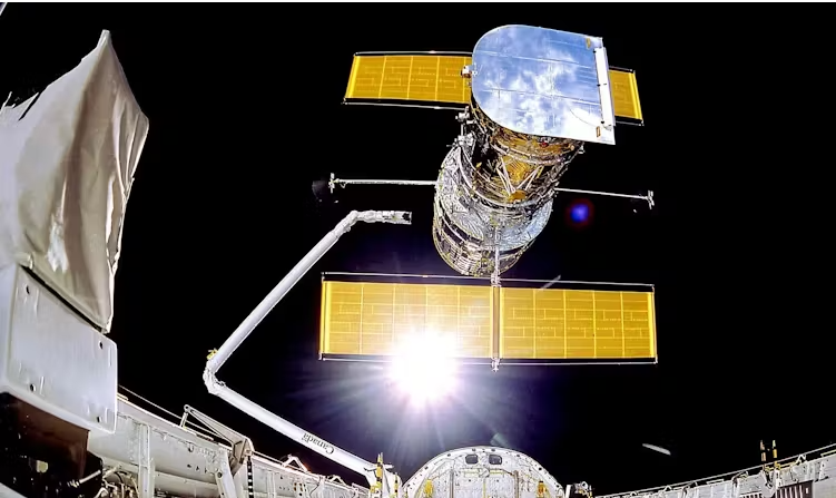 1990년 4월 우주왕복선에서 전개되는 허블 우주망원경. Nasa/Smithsonian Institution/Lockheed Corporation