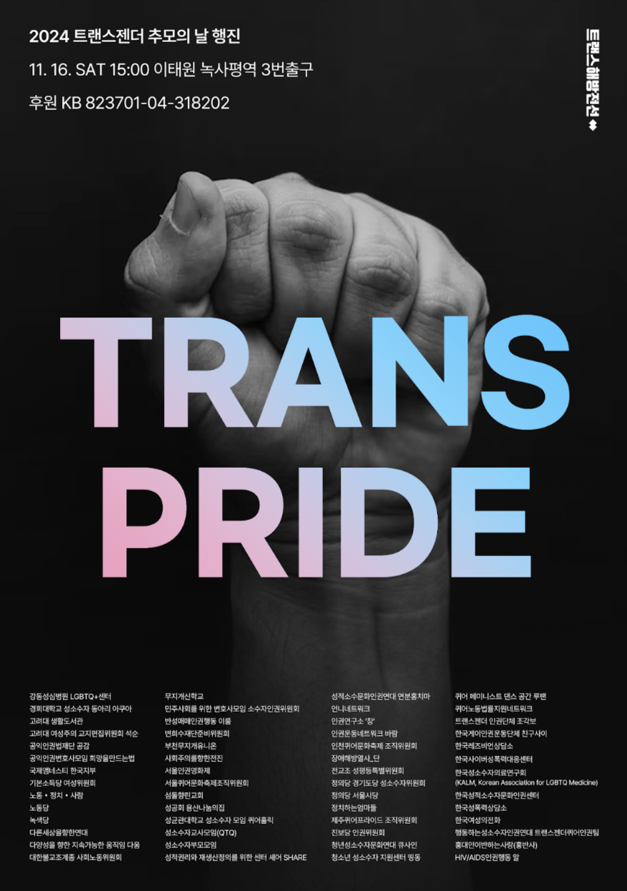 11월 16일 토요일, 트랜스해방전선 등 56개의 인권시민사회단체가 공동주최하는 트랜스젠더 추모의 날 집회 및 행진이 진행됐다. ‘Trans Pride’라는 슬로건 하에 진행된 이  역시 추모와 기억 위에 쌓아올린 우리의 간절하고도 치열한 삶의 표현이다. 우리의 요구는 다음과 같다.