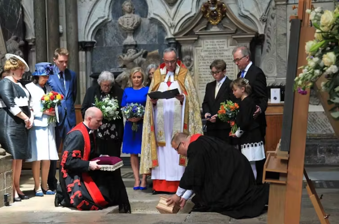 웨스트민스터 사원(Westminster Abbey)에 있는 호킹의 묘지에 유골함을 안치하고 있는 장면런던 웨스트민스터 사원의 학장과 의회가 주관허가를 받아 재현된 내용이다.