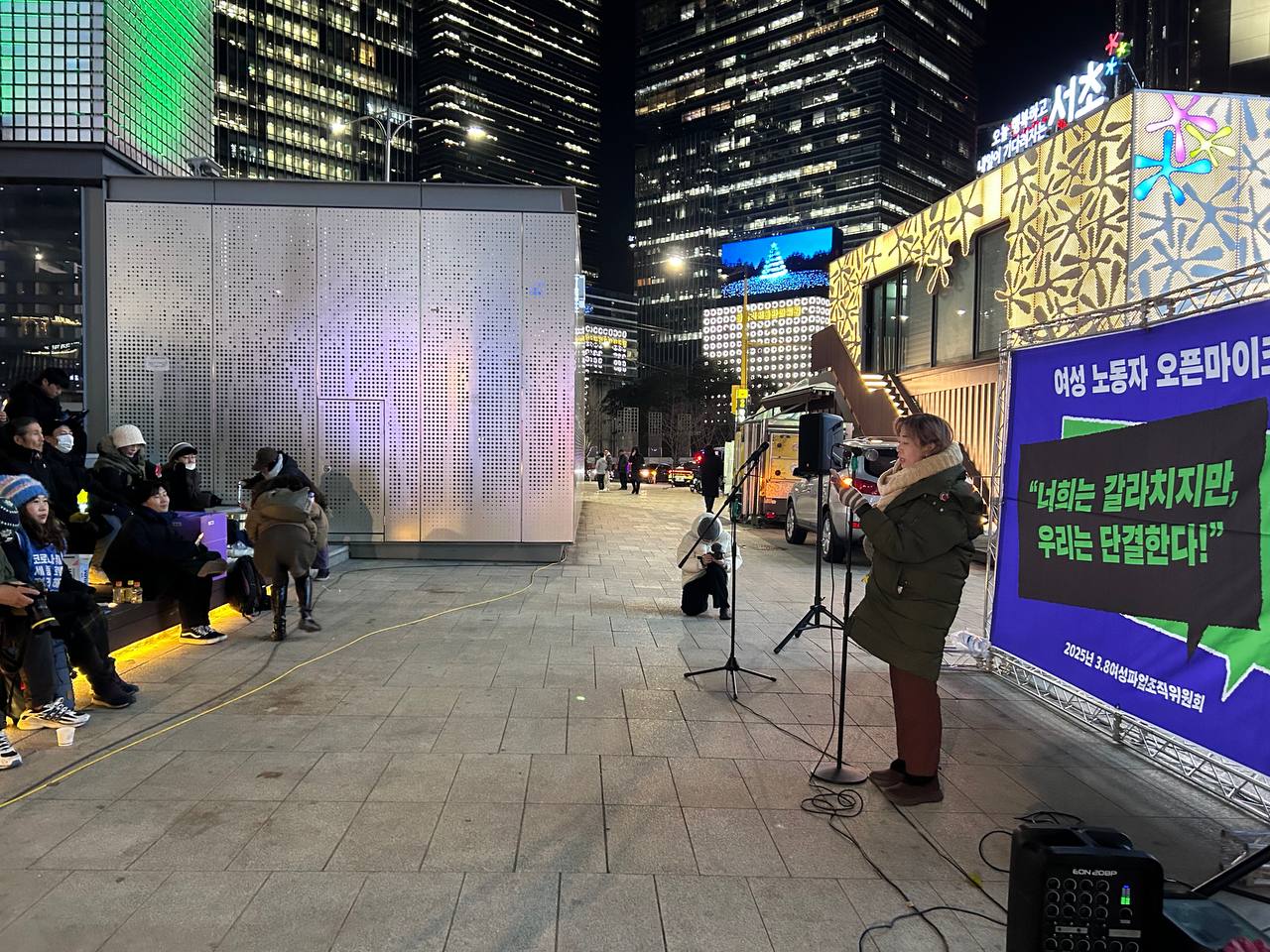 [편집자 주] 윤석열 비상계엄 시기에 삼성을 주목하는 여성들이 있습니다. 윤석열은 애초 여성 혐오를 발판으로 집권했고, 대신 자본을 비호했기 때문이라고 합니다. 그래서 여성파업을 준비해 온 2025년 3.8여성파업조직위원회는 자본에도 이 사태에 대한, 구조적 성차별에 대한 책임을 묻고 있습니다. 이에 조직위는 12월 말 문제의 첫 번째 기업인 삼성전자의 4차 배당일을 앞두고 여성 노동자의 목소리를 조명하는 오픈 마이크를 진행했습니다. 이날 현장에서 삼성전자의 성차별과 폭력을 규탄한 여성 노동자와 활동가들의 목소리를 연재합니다.