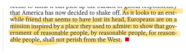 "한때 존경했던 곳에서 영감을 받아, 유럽인들은 임무를 수행하고 있다. 즉, '이성적인 사람들에 의한, 이성적인 사람들을 위한, 이성적인 사람들의 정부'가 서구에서 사라지지 않도록 하는 것이다."