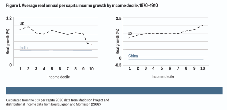 국가 간 불평등이 증가했을 뿐만 아니라부유국 내부의 불평등도 증가했다미국의 경우소득 상위 10분위가 더 빠르게 성장하면서 그래프의 기울기가 상승 곡선을 그린다영국은 다소 예외였는데, 1기 세계화가 시작되기 직전인 1860~70년대에 불평등이 최고조에 달했다과거 소득 분포를 알려주는 주요 자료인 영국의 사회 계층표(social tables)에서 로버트 더들리 백스터가 1867(카를 마르크스의 『자본』이 출간된 해이기도 하다)에 작성한 자료가 19세기 중 가장 불평등했던 시기를 보여준다이후 영국은 근로시간 제한아동 노동 금지참정권 확대 등 일련의 진보적 법률 덕분에 불평등을 줄일 수 있었다독일도 1860년대 말 통일 이후 불평등이 증가했다는 최근 데이터가 이를 뒷받침한다프랑수아 부르기뇽과 크리스티앙 모리송의 데이터를 기반으로 한 그래프는 인도와 중국의 불평등 변화에 대한 정보가 없어이 두 국가는 소득 분포선이 수평으로 표시되어 있다(모든 소득 계층이 같은 비율로 성장한 것으로 가정한다). 그러나 파쿤도 알바레도오귀스탱 베르제롱길렘 카상 등의 경제학자가 작성한 새로운 인도 세수 자료는 소득 상위층에 초점을 맞추며불평등이 매우 높지만 안정적으로 유지되었다는 점을 보여준다전반적으로세계화 1기 동안 국가 간 불평등과 다수 국가 내 불평등 모두가 증가했다.