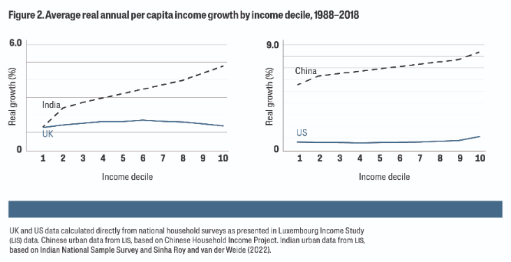 하지만 세계화 1기와는 달리세계화 2기 동안에는 세계 불평등이 감소했다이는 아시아의 대형 경제권들이 높은 성장률을 기록했기 때문이다다만 각국 내부의 불평등은 오히려 증가했다가장 뚜렷한 예가 중국이다개방 개혁 이후 중국의 지니계수는 거의 두 배로 증가했다인도도 마찬가지다도표 2는 인도와 중국 내 부유층의 소득 증가율이 자국 내 빈곤층보다 더 가파르게 증가했음을 보여준다선진국에서도 불평등은 증가했다이는 마거릿 대처와 로널드 레이건의 정책에서 비롯되어 토니 블레어와 빌 클린턴 시절에도 이어졌고, 21세기 둘째 십 년대에 이르러서야 어느 정도 정체되었다.