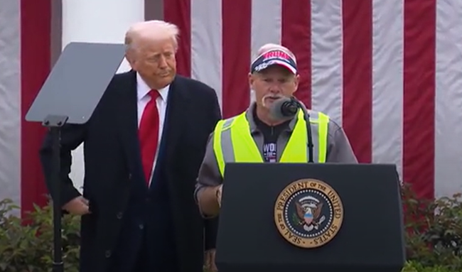 4월 2일, 자동차 노동자가 트럼프의 행정명령 지지 연설을 하고 있다. 출처: 현지 방송 화면 갈무리