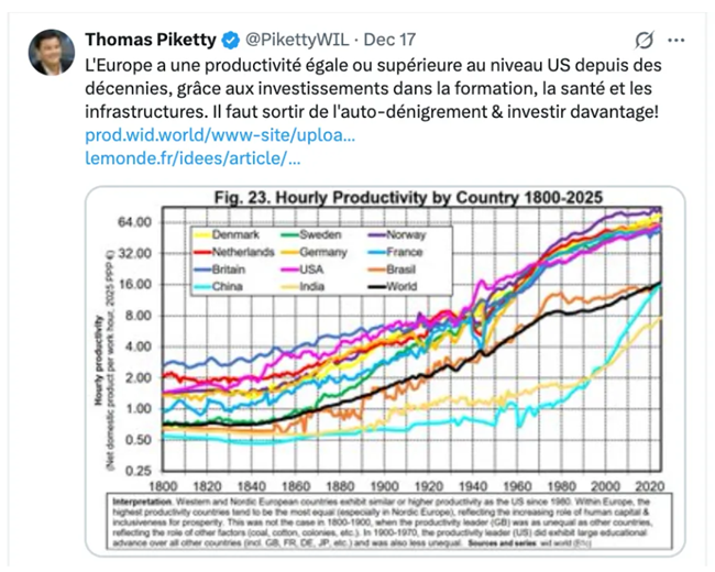 토마 피케티(Thomas Piketty), “유럽은 수십 년 동안 미국과 같거나 그보다 높은 생산성을 보여 왔다. 이는 교육, 보건, 인프라에 대한 투자 덕분이다. 자기비하에서 벗어나 더 많이 투자해야 한다.”