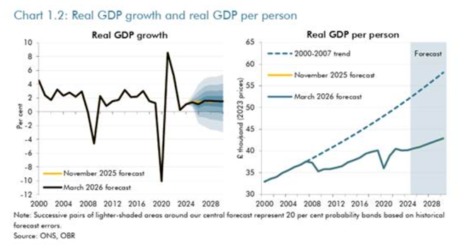한편, 영국 경제는 계속 휘청거렸다. 2025년 실질 국내총생산(Real GDP) 성장률은 겨우 1.3%였고(그해 초의 전망치보다 낮았다), 2025년 마지막 분기에는 그 성장률이 전년 대비 겨우 0.1%로 떨어졌다. 영국 재정책임청(Office for Budget Responsibility, OBR)은 올해 실질 국내총생산 성장률을 겨우 1.1%로 전망했는데, 이 수치는 불과 6개월 전의 1.4% 전망에서 더 낮아진 것이다.