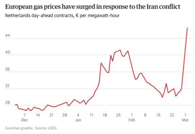 <이란 분쟁에 대응해 유럽 가스 가격이 급등했다. 네덜란드 익일물 계약 가격, 메가와트시(MWh)당 유로>
