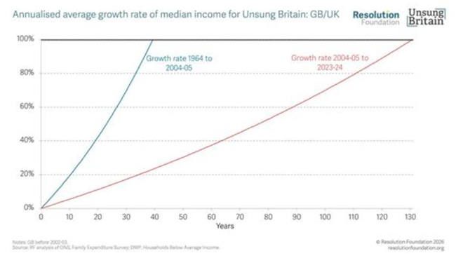 “이름 없이 버텨 온 영국(Unsung Britain)”은 가처분소득 분포의 하위 절반에 속한 1,300만 노동연령 가구(2,700만 명을 포함한다)를 가리킨다. “이 가구들은 이전 세대보다 더 많이 일하고, 더 많이 돌보고, 더 많이 기여하고 있지만, 이러한 노력에 대한 보상은 정체되어 있다.” 이 집단의 전형적인 가처분소득은 2000년대 중반 이후 연평균 겨우 0.5퍼센트 증가하는 데 그쳤다. 이 수치는 이전 수십 년 동안 누렸던 성장의 극히 일부에 불과하다. 2004~05년까지의 40년 동안 비슷한 가구들의 소득은 두 배로 증가했다. 그러나 오늘날과 같은 속도라면 같은 수준의 개선을 달성하는 데 130년이 넘게 걸릴 것이다.