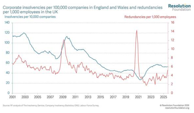 <잉글랜드와 웨일스에서 기업 10만 개당 기업 파산 건수와 영국에서 노동자 1,000명당 정리해고 규모>