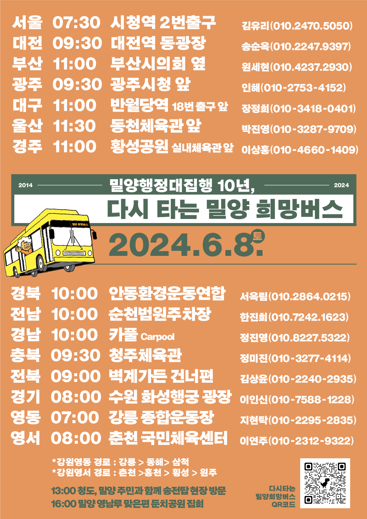 다음 달 6월 8월, 밀양으로 다시 버스가 떠난다. 십여 년 전, 전국 각지에서 밀양 주민들과 연대하기 위해서 출발했던 ‘밀양 희망버스’가 다시 준비되고 있다(전국 각지에서 출발하는 버스 안내는 포스터 참조). 단지 10년 전 일을 기억하기 위해서가 아니라, 윤석열 정부의 핵폭주에 맞서는 저항의 목소리를 모으려는 집회에 참여하려는 버스다. 아직도 깃발을 꺽지 않고 싸우고 있는 밀양에서, 함께 공동 전망을 만들기 위한 질문에 묻고 답하는 노력이 이루어지면 좋겠다. 많은 이들이 동참해 주었으면 좋겠다.
