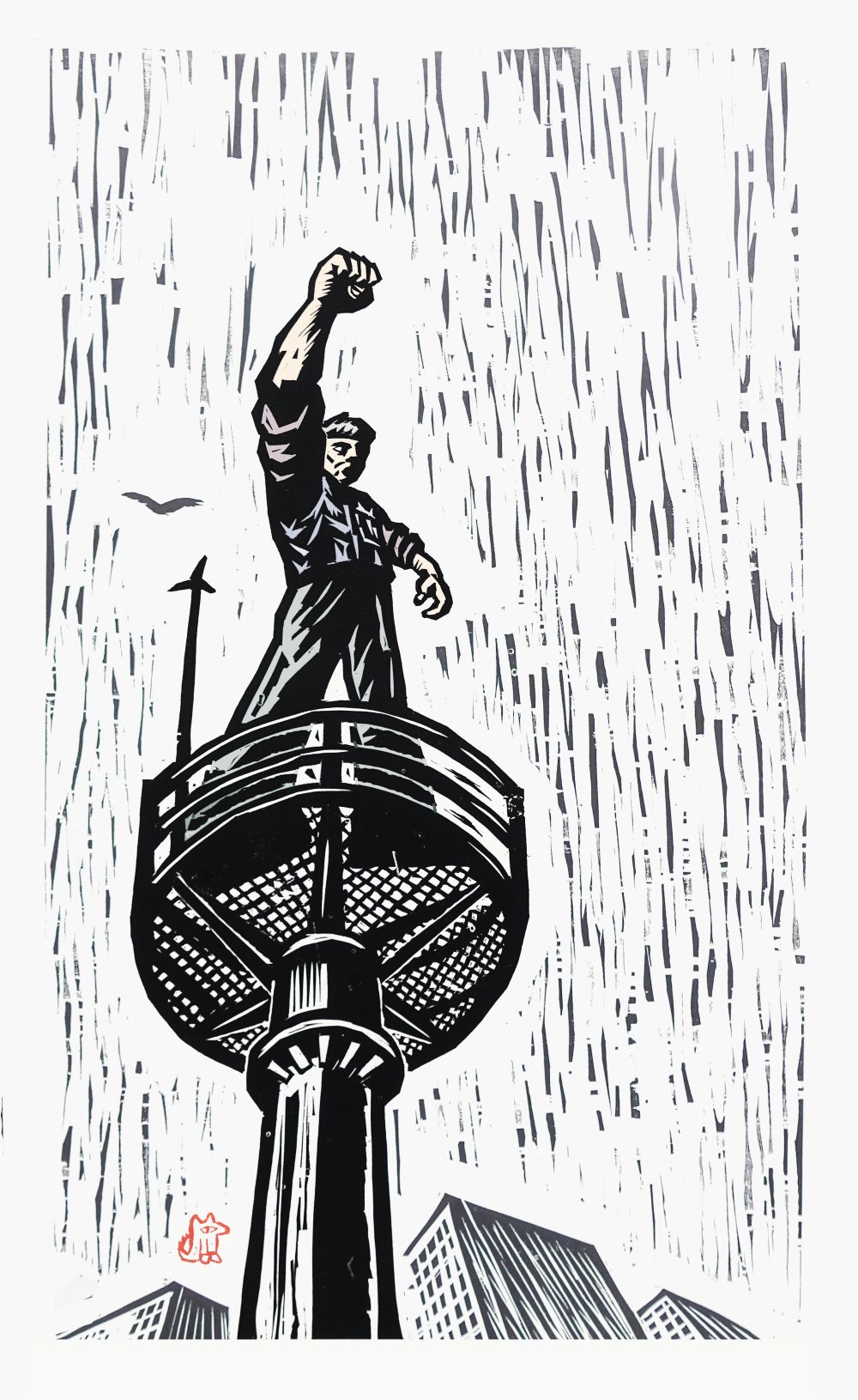 또 한 명의 노동자가 높은 탑에 올랐다.