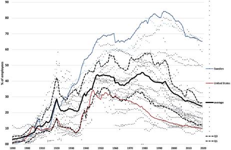 노조 조직률 1890-2019, 30개 산업 국가