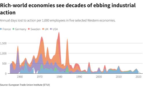 집단적 노동 조직의 약화로 인해 노동자들이 직장에서 자신의 권리를 방어하고 더 나은 임금과 조건을 얻을 수 있는 능력도 후퇴했다노사 분쟁 수준은 급격히 감소했다. 2020년 팬데믹 침체 이전주요 '부자경제에서 노사 분쟁으로 인한 연간 손실 일수는 사상 최저치에 가까웠다.