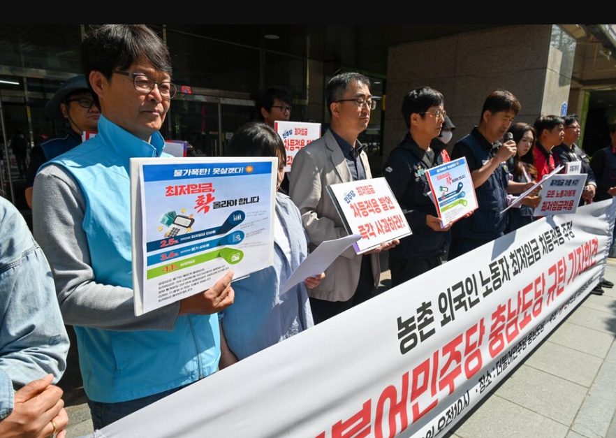 민주노총 세종충남본부 "농촌 외국인노동자 최저임금 차등 지급 주장하는 더불어민주당 충남도당 규탄" 기자회견(2024/05/10) 출처 : 노동과 세계, 촬영 : 백승호 (필자 제공)