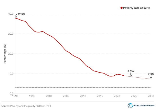 불과 10년 전만 해도 더 큰 낙관이 가능했다. 1990년부터 2015년 사이 지속 가능한 발전에 있어 상당한 진전이 이루어졌고, 10억 명 이상이 극빈에서 벗어나는 기념비적인 성과를 거두었다이는 주로 중국과 인도의 강력한 경제 성장 덕분이었고이를 통해 가장 부유한 국가들과 가장 가난한 국가들의 소득 격차가 좁혀졌다그러나 빈곤을 완전히 근절할 수 있을 것 같던 길은 이후 흐려지고 말았다현재 전 세계 빈곤율은 겨우 팬데믹 이전 수준으로 회복되었으나앞으로 몇 년간의 전망은 암울하기 그지없다세계 인구의 거의 절반인 약 35억 명이 하루 6.85달러 이하로 생활하고 있으며이는 중상위 소득국의 빈곤선에 해당한다더욱 극단적으로는 약 7억 명이 하루 2.15달러 이하로 생활하고 있으며이는 저소득 국가의 빈곤선에 해당한다극빈은 점점 사하라 이남 아프리카나 분쟁과 불안정에 시달리는 지역에 집중되고 있다.