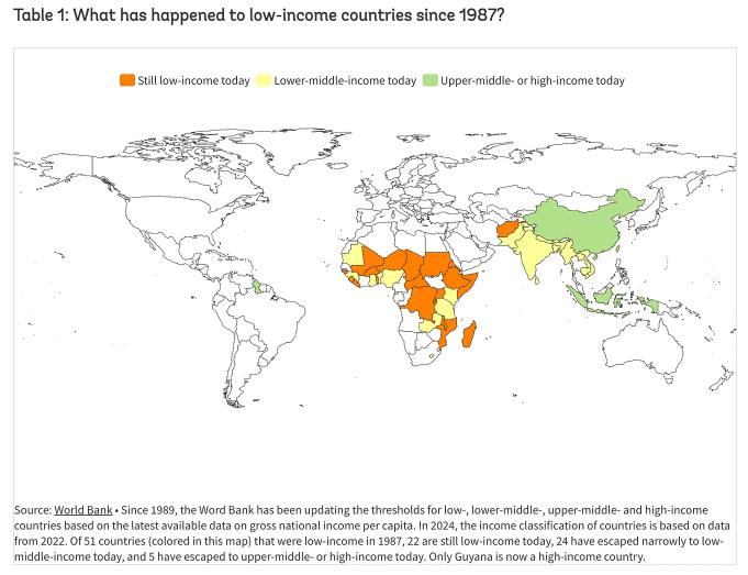이를 더 구체적으로 이해하려면 개별 국가들을 살펴보는 방법이 있다. 1987년 아프리카와 아시아에는 51개의 극빈국이 존재했으나그중 29개국이 빈곤에서 벗어나 중간소득국 대열에 합류했다여전히 22개국은 극도로 낙후된 상태로 남아 있는데그중 하나는 아프가니스탄이고 나머지 21개국은 모두 사하라 이남 아프리카에 있다.