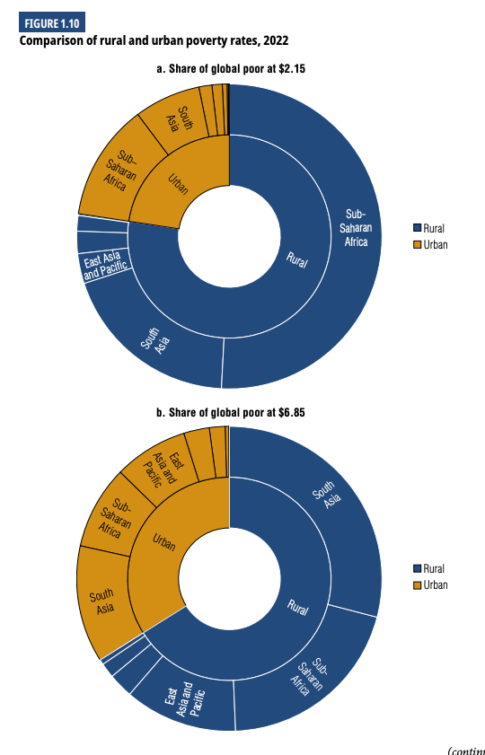 2022년 전 세계 극빈층의 4분의 이상이 농촌에 살고 있었으며전 세계 극빈층의 절반은 사하라 이남 아프리카의 농촌 지역에 집중되어 있었다거의 모든 지역에서 농촌 빈곤율이 도시 빈곤율보다 높으며전 세계적으로 농촌 빈곤율은 16%, 도시 빈곤율은 5%이다특히 사하라 이남 아프리카에서는 농촌 빈곤율이 46%도시 빈곤율 20%에 비해 큰 격차를 보이고 있다.