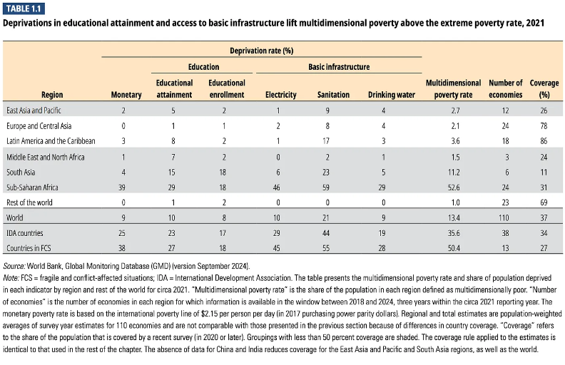사하라 이남 아프리카와 분쟁 및 불안정 국가(FCS) 인구의 약 절반은 전기나 위생 시설이 부족하다교육 격차도 여전히 크다자료가 있는 20개의 저소득 국가에서는 초등학교를 마칠 때까지 90% 이상의 어린이가 기본적인 글을 읽거나 이해하지 못한다그럼에도 불구하고 저소득 국가들의 교육 투자는 매우 저조하다. 2021년 저소득 국가들은 학생 한 명당 연간 평균 54달러만을 지출했는데이는 고소득 국가의 평균 8,500달러에 크게 못 미친다사하라 이남 아프리카의 최빈국들에서는 응답자의 20%만이 부모 세대보다 더 높은 교육 수준을 달성했으며이는 동아시아의 80%와 대조적이다.