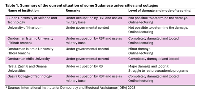 2019년 이후수단 대학들은 정치적 불안정과 COVID-19 팬데믹으로 인해 학문적 무질서를 경험해왔다그럼에도 이러한 상황은 대학들이 전자 학습 시스템을 도입하도록 하는 계기가 되었다그 결과전쟁이 시작되었을 때 대학들은 이미 이 분야에서 일정한 전문성을 갖추고 있었으며대부분의 대학들은 전자 학습 플랫폼을 구축했다전쟁이 진행되는 현실 속에서대학 행정 당국은 기존의 전자 학습 시스템을 활용하여 학부 과정의 지속에 집중하고 있다대학들은 일부 문제들에 대한 해결책을 마련하는 데 성공했으며많은 대학들이 온라인안전한 지역혹은 해외에서 학술 프로그램을 개설하기 시작했다일부 수단 대학들은 이미 몇몇 강의(특히 의과대학 고학년 과정)를 다른 국가로 이전했으며이는 비용이 매우 큰 대안이다더욱이다수의 대학들이 비교적 안전한 지역에 있는 자매 대학들과 양해각서를 체결했다이러한 조치는 많은 대학들이 교육과정의 실습 부분을 이수하는 데 기여했다또한일부 수단 대학들은 해외에 지부를 설립하기도 했다.