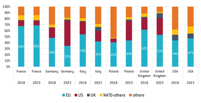 현재 유럽 군대가 핵심 무기 체계를 미국으로부터 수입하는 경향에 대한 한탄이 자주 들린다물론이러한 조달에는 지정학적·정치적 계산이 크게 작용한다예를 들어베를린이 미국과 이스라엘 미사일에 강하게 의존하는 방공체계를 구축하려는 구상에는 다양한 정치적 셈법이 얽혀 있다자료에서 나타나듯이독일은 유럽 이웃 국가들보다는 미국으로부터의 수입을 선호하는 경향이 뚜렷하다.