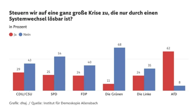 AfD 지지층의 뚜렷한 특징 중 하나는이들이 자신의 개인적 처지만이 아니라 독일 사회 전체의 전망에 대해서도 매우 깊은 비관론을 갖고 있다는 점이다. 2023년 당시 AfD 유권자의 62%는 독일이 체제 변화’ 없이는 해결될 수 없는 중대한 위기를 향해 가고 있다고 답했다그들은 당시 녹색당 지지자들과는 극명하게 반대되는 위치에 있었다그러나 2년이 지난 지금언론 보도의 종말론적 어조는 오히려 AfD가 하던 주장을 대신해 주고 있는 형국이다.